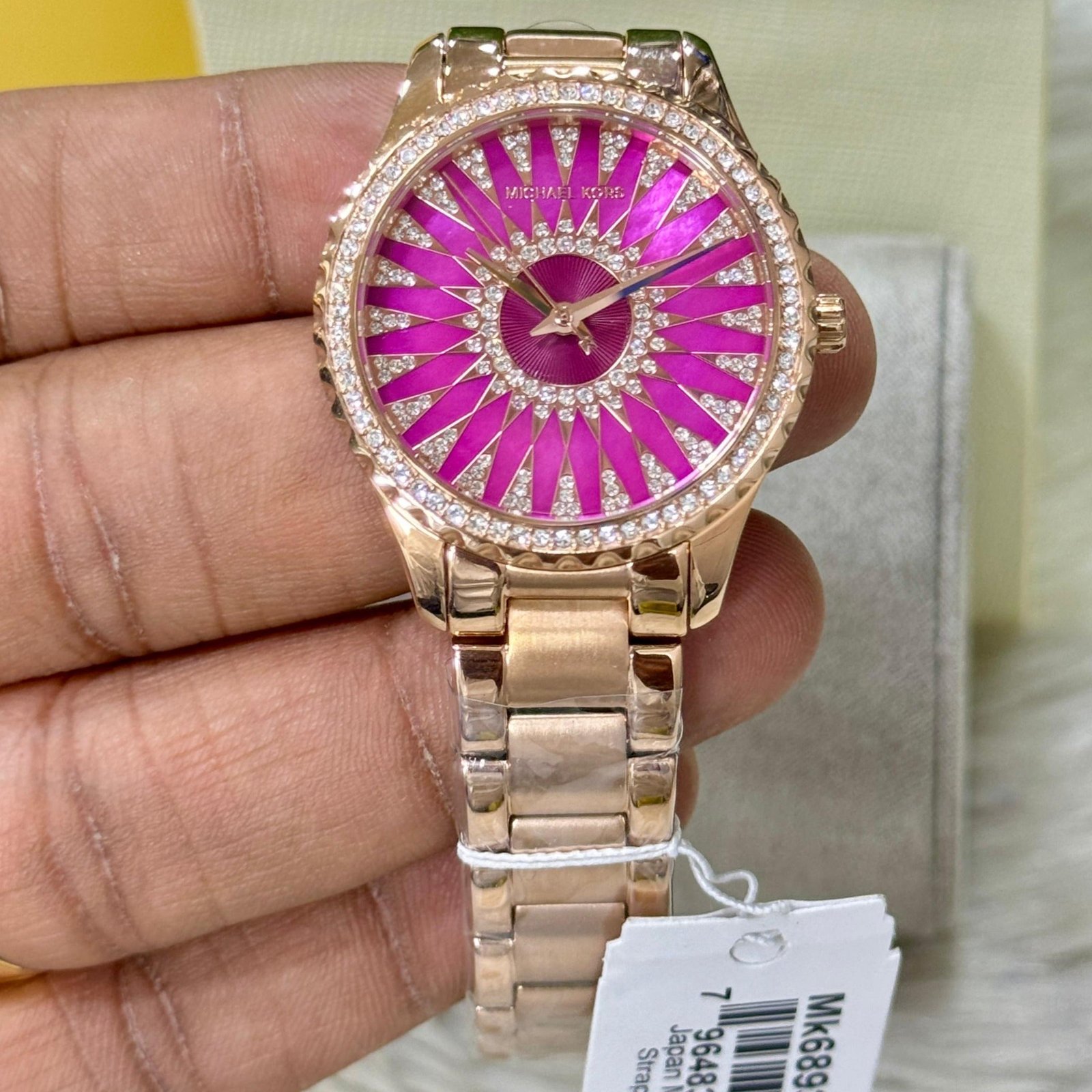 Rest assured, each MK Premium Ladies Watch is 100% original, ensuring unparalleled quality and authenticity. The model number, MK6893, signifies its exclusivity and prestige. With a metal chain strap and a dial adorned with pink and white diamonds, this watch is a true statement piece.