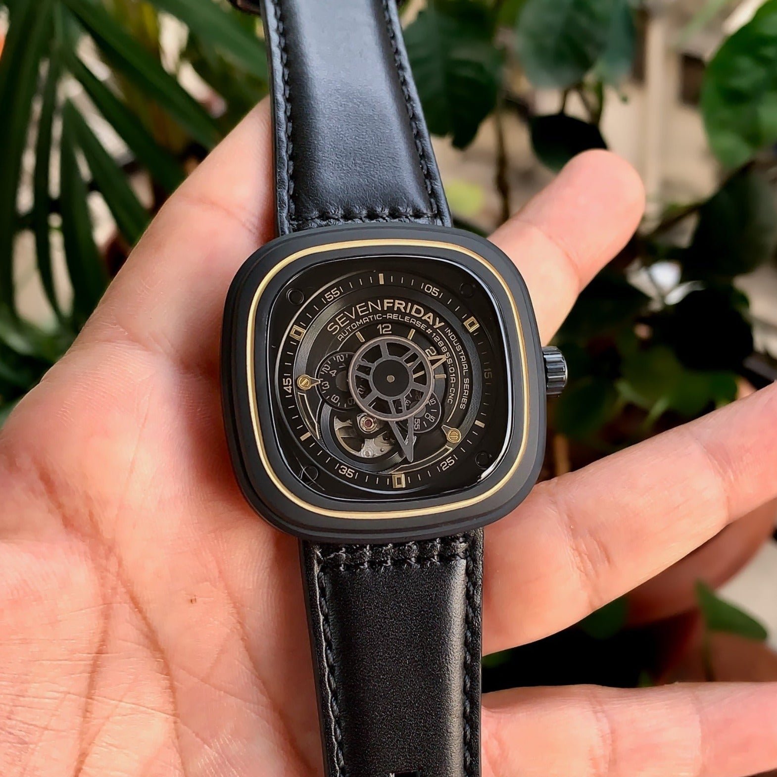 - Dial: Square Shape with Black Steel Case, Golden Bezel, and Skeleton Mechanical Dial with All Chronograph Functions