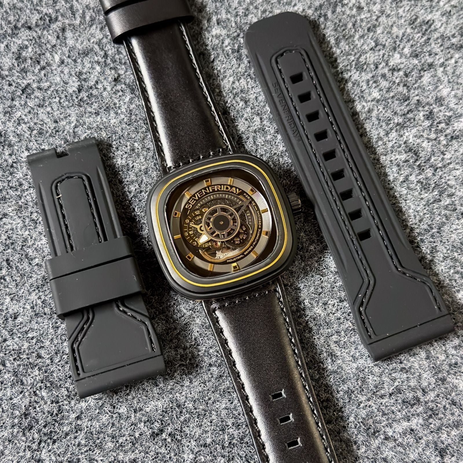 This watch features a high-quality leather strap that ensures both comfort and durability. The black metal Seven Friday crown, embossed steel case back, and metal black Seven Friday original lock add to the overall sophistication of the design.