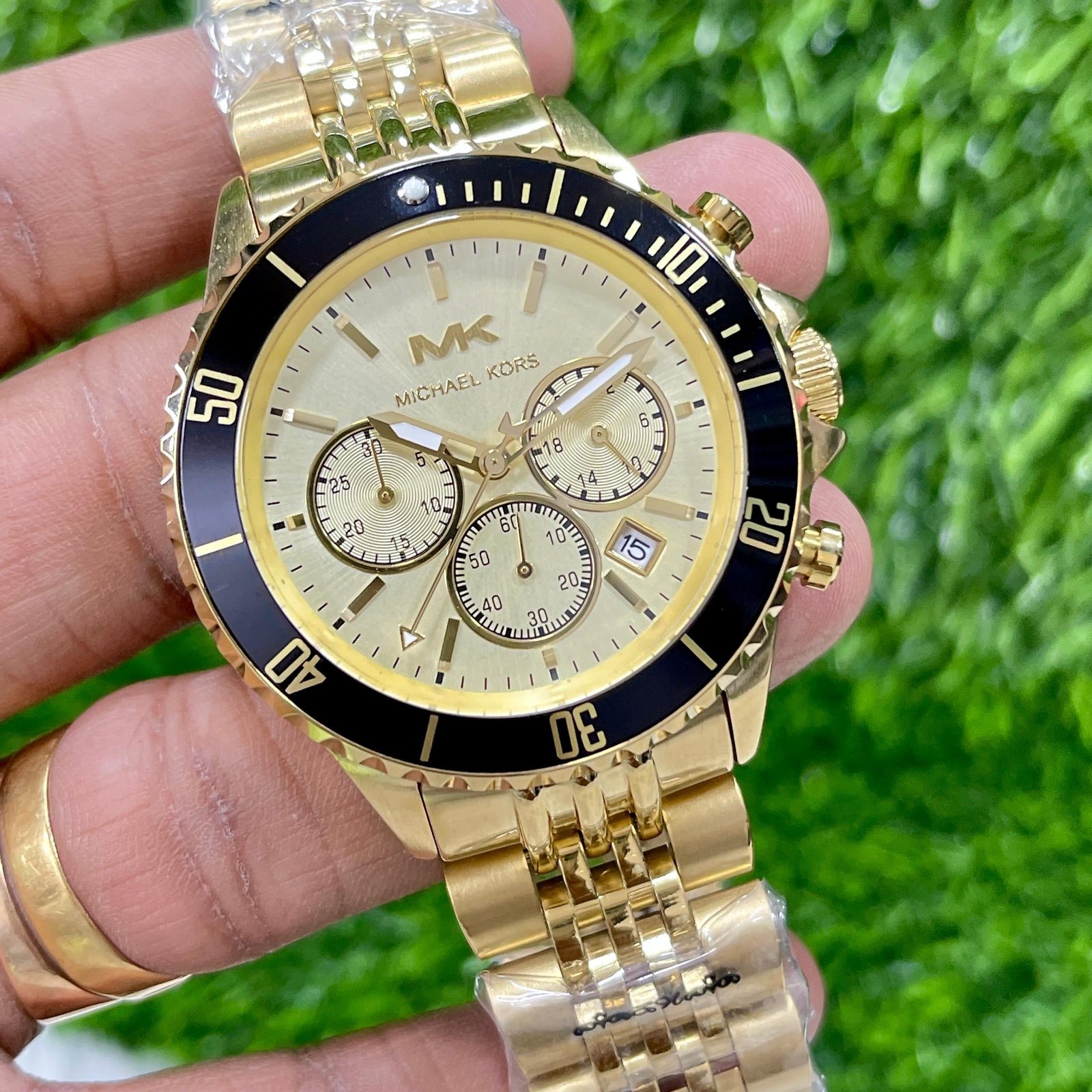 Introducing the New Latest Model, the MK Golden Chrono Working Gents Watch, designed to elevate your style to new heights. With a full golden design and high-quality craftsmanship, this watch is a symbol of opulence and sophistication.