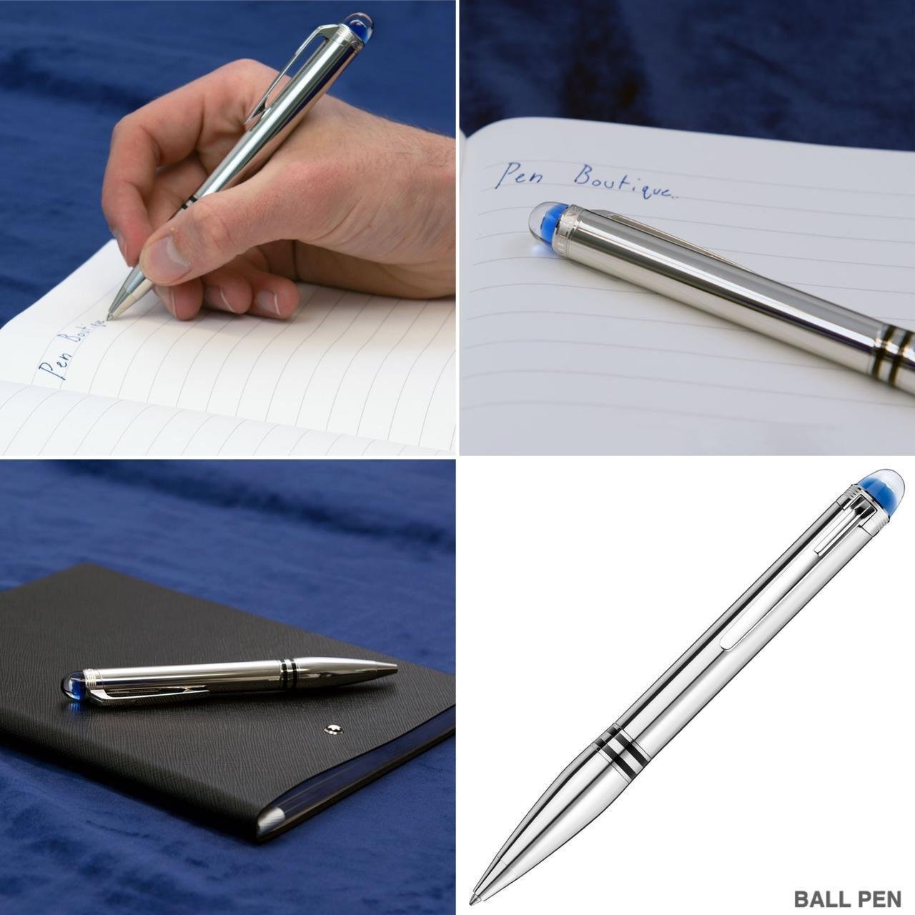 The Starwalker ballpoint pen with twist mechanism. This piece is made in stunning high polished white metal, with the floating Montblanc emblem in transparent cap-top and finished with SILVER rings.
