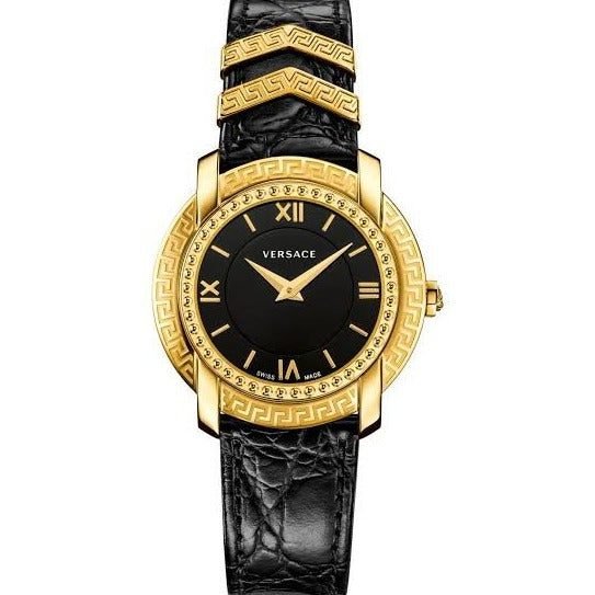 Crafted to perfection, this watch boasts 7AA premium quality. Its stainless-steel gold-tone round case, adorned with greca engraving on the bezel, embodies exquisite craftsmanship. The anti-reflective sapphire glass on the black dial, complemented by gold indices and hands, exudes sophistication, ensuring both durability and style.