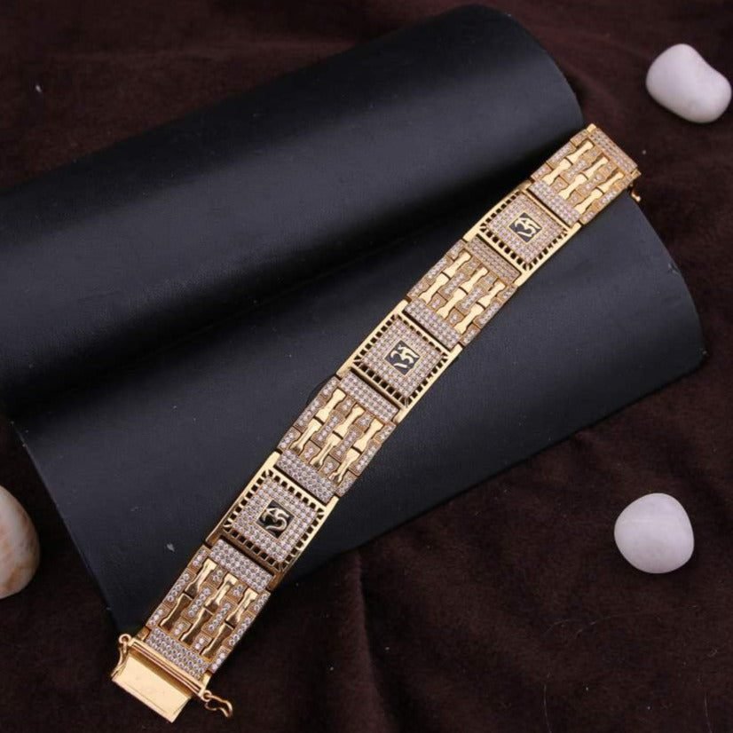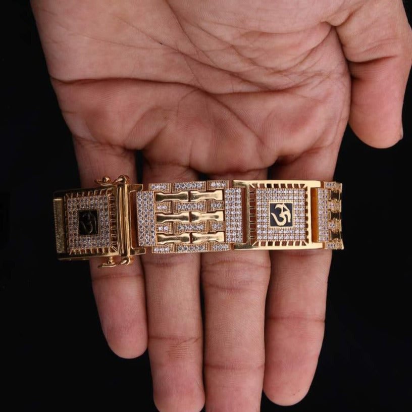 Introducing the Square Type 4 OM Symbol With Black Mino Gold Plated Bracelet Jewelry, Style A399. This timeless piece of religious jewelry combines elegance and spirituality, making it a must-have accessory for any occasion. Crafted with a polished gold-plated surface and adorned with a diamond in the center of the Om symbol, this bracelet adds a touch of class to any outfit.