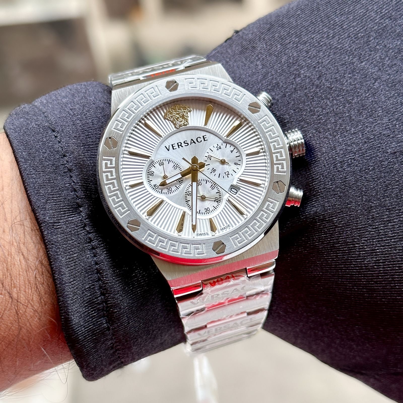 Versace is one of the most Versatile Brand for it’s exquisite collection, furthering the brand’s pursuit of innovation, the Greca Chrono uses Indiglo technology, with which a blue light emanates from the Midnight Blue dial when the crown is pushed